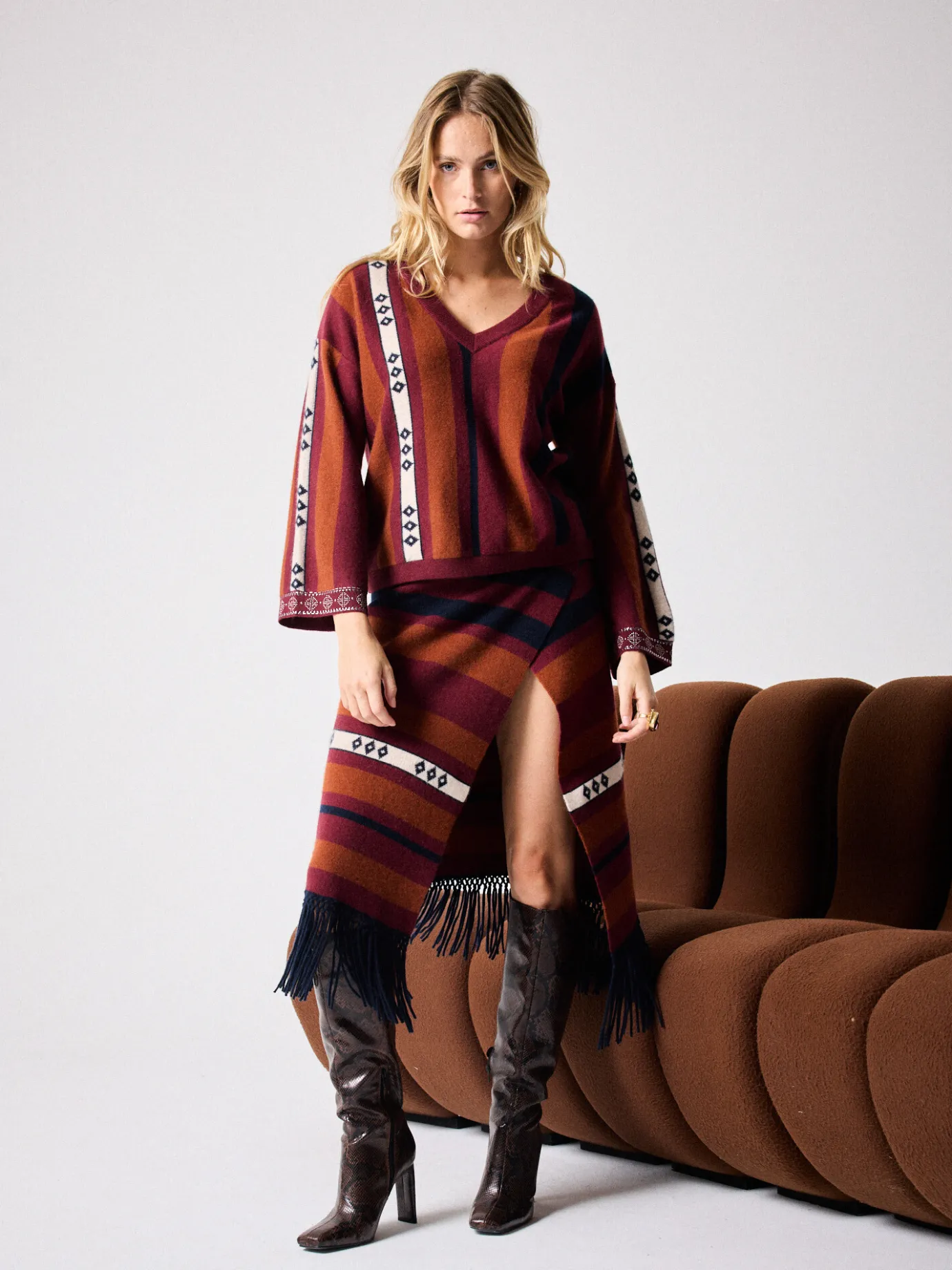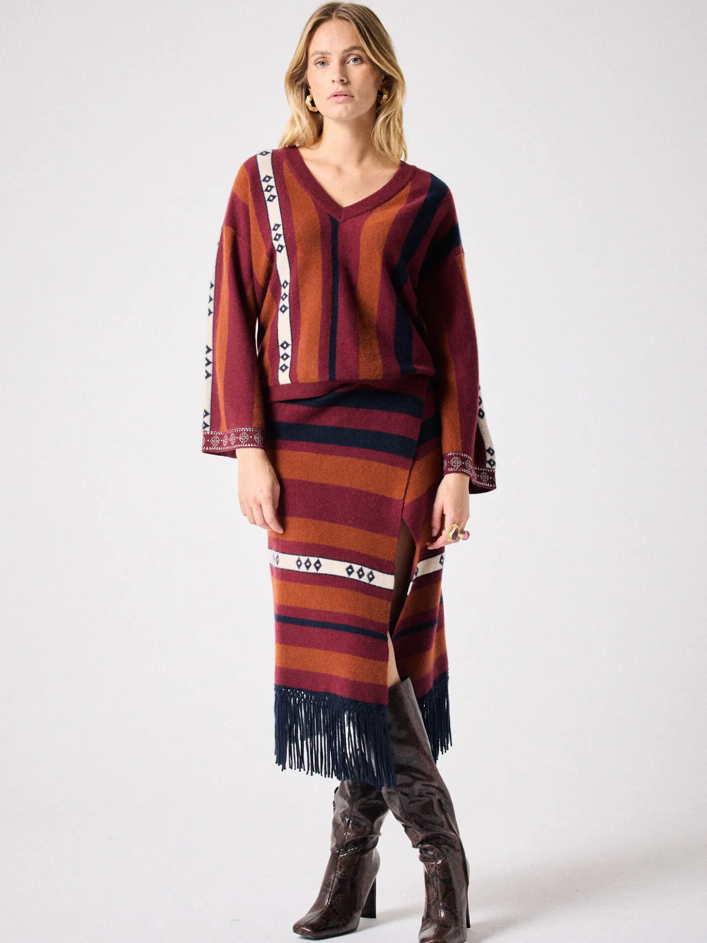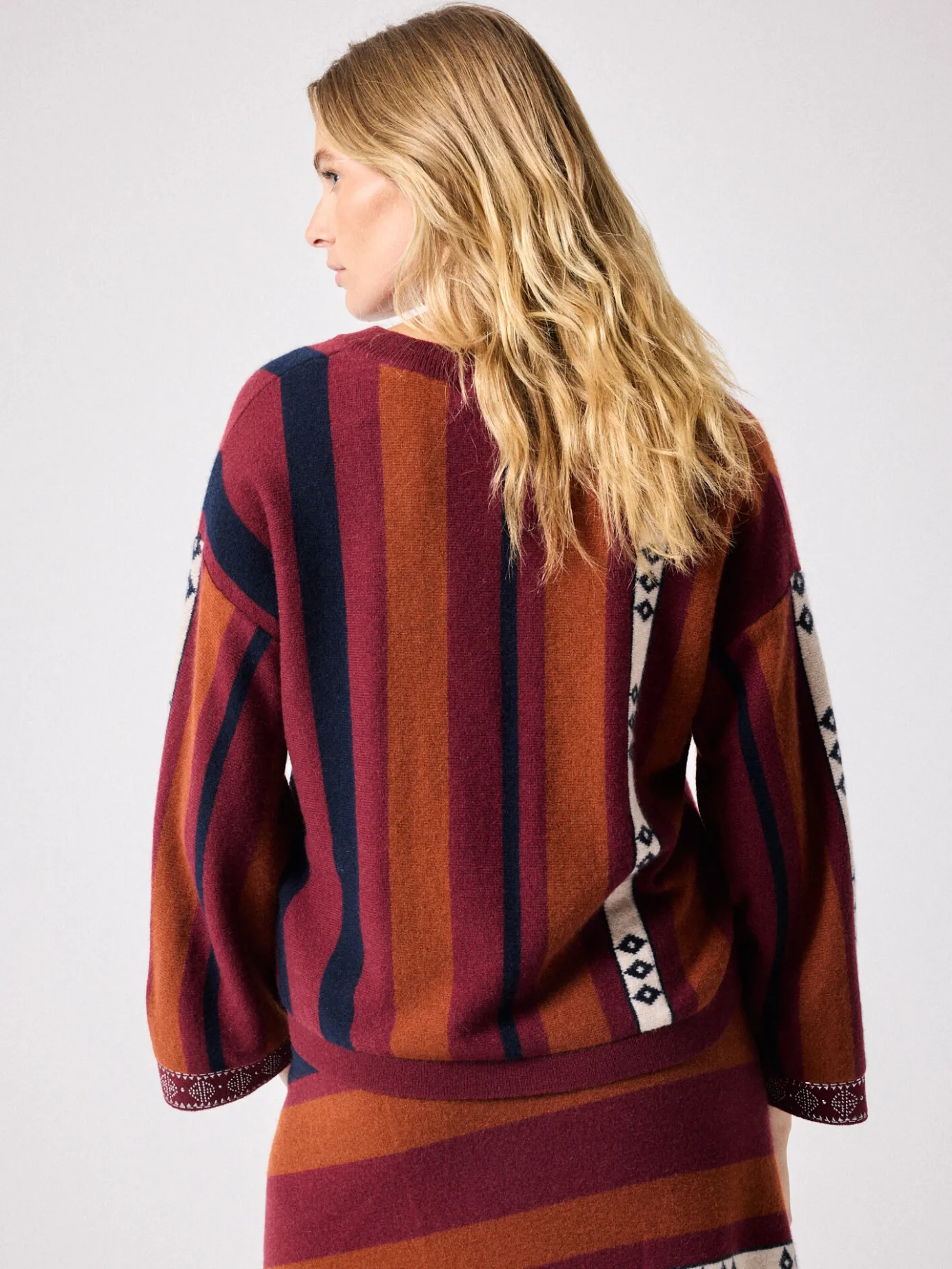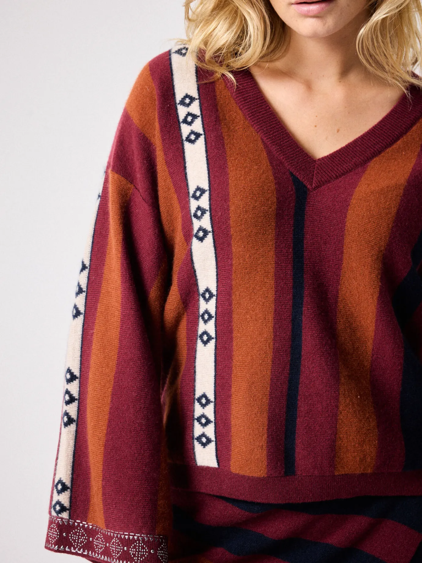 DescriptionPull pour femme, col V, manches longues, rayures bohémiennes- Détails clous manches- Coupe ample- Pull 100%…